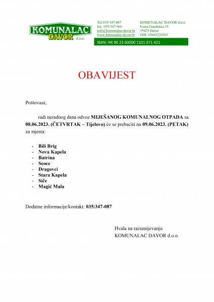 Obavijest Komunalca Davor d.o.o. odvoz miješanog  otpada na 9. lipnja 2023.