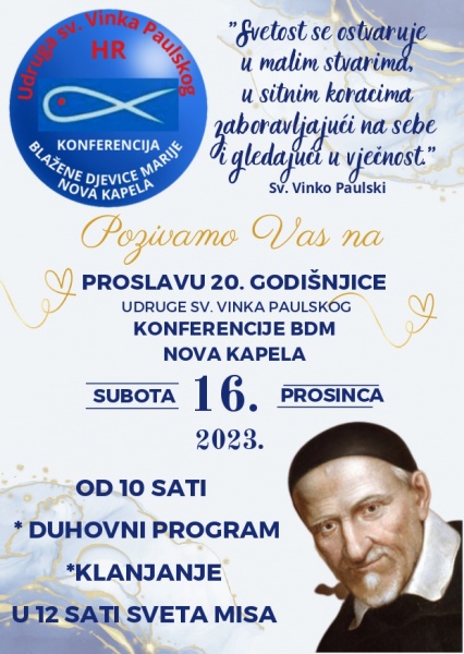 PROSLAVU 20. GODIŠNJICE UDRUGE SV. VINKA PAULSKOG KONFERENCIJE BDM NOVA KAPELA 16.12.2023.