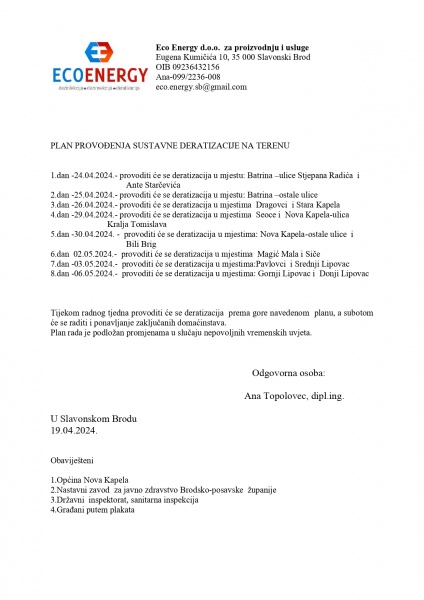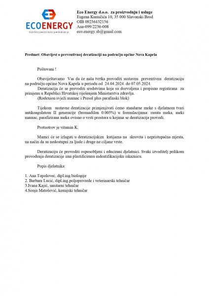 Obavijest i plan provedbe sustavne deratizacije u općini Nova Kapela 24.4.-7.5. 2024.