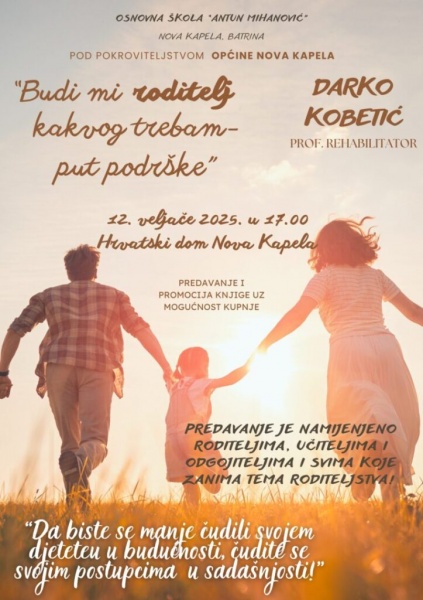 Čast nam je pozvati vas na predavanje uz promociju knjige (i mogućnost kupnje) „Budi mi roditelj kakvog trebam-put podrške!“ autora Darka Kobetića koje će se održati, pod pokroviteljstvom Općine Nova Kapela, 12. veljače 2025. (srijeda) u 17.00 u Hrvatskom domu u Novoj Kapeli.