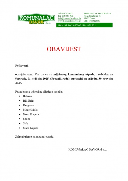 Obavijest Komunalca Davor d.o.o. odvoz miješanog otpada zbog neradnog dana 1.5.2025.