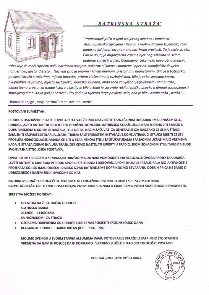 Udruga Sveti Antun iz Batrine nastavlja sa svojim aktivnostima oko uređenja svoga mjesta a posebno njegovog središta na trgu Ljudevita Gaja.Na red je došla obnova za mještane Batrine kultna "stražara". Na radnu akciju koja je održana u subotu 28.travnja 2012.godine odazvao se veliki broj ne samo članova udruge već i mještana posebno mladih koji su se dragovoljno prijavili na akciju. Fotografije govore više od riječi.Čestitke batrincima.