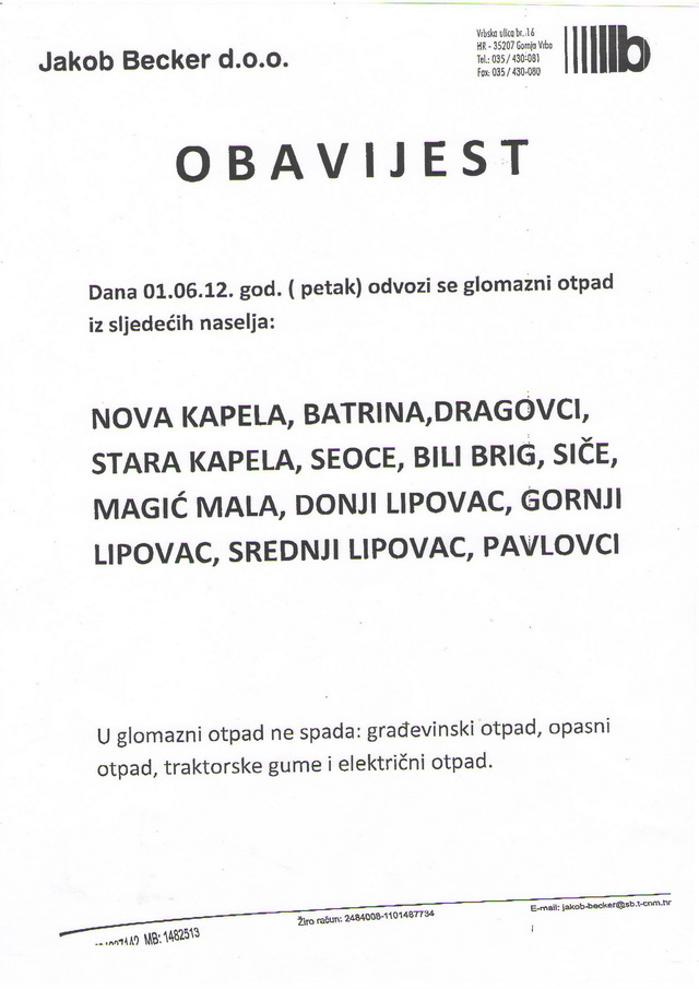 Tvrtka "Jakob Becker" d.o.o. dana 01.lipnja 2012.godine ( PETAK ) odvoziti će glomazni otpad iz svih naselja općine Nova Kapela.