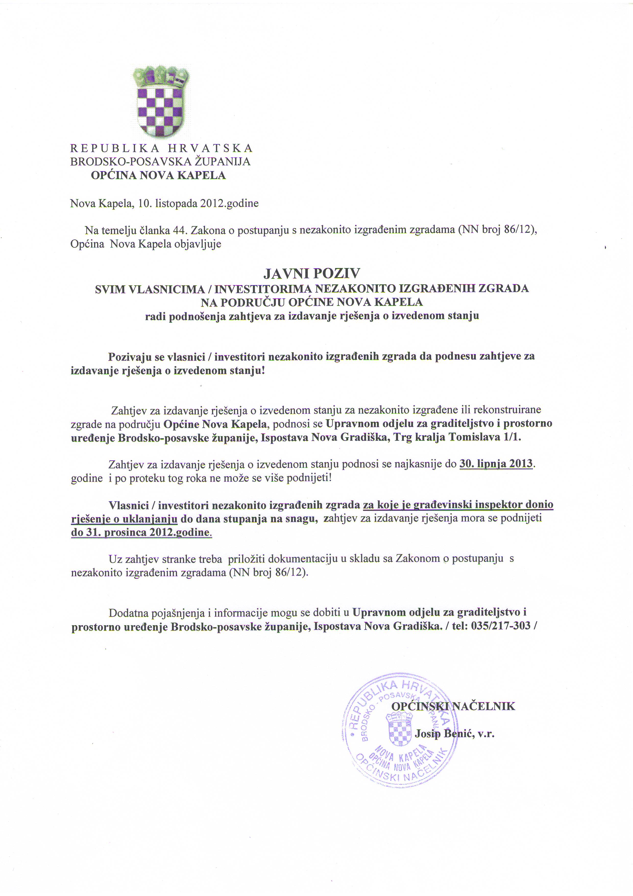Javni poziv svim vlasnicima/investitorima nezakonito izgrađenih zgrada na području Općine Nova Kapela