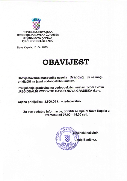 OBAVIJEST O PRIKLJUČENJU GRAĐEVINA NA VODOOPSKRBNI SUSTAV ZA NASELJE DRAGOVCI