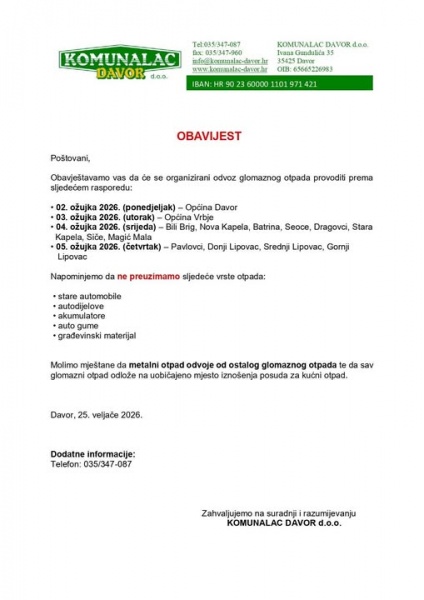 Obavjest Komunalca Davor o odvozu glomaznog otpada  4.i 5.ožujka 2026.
